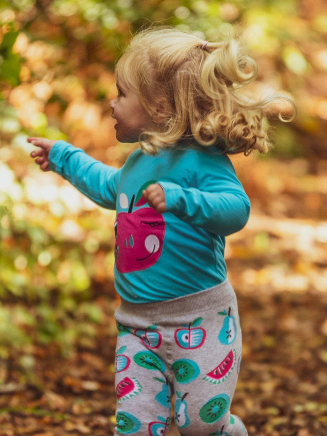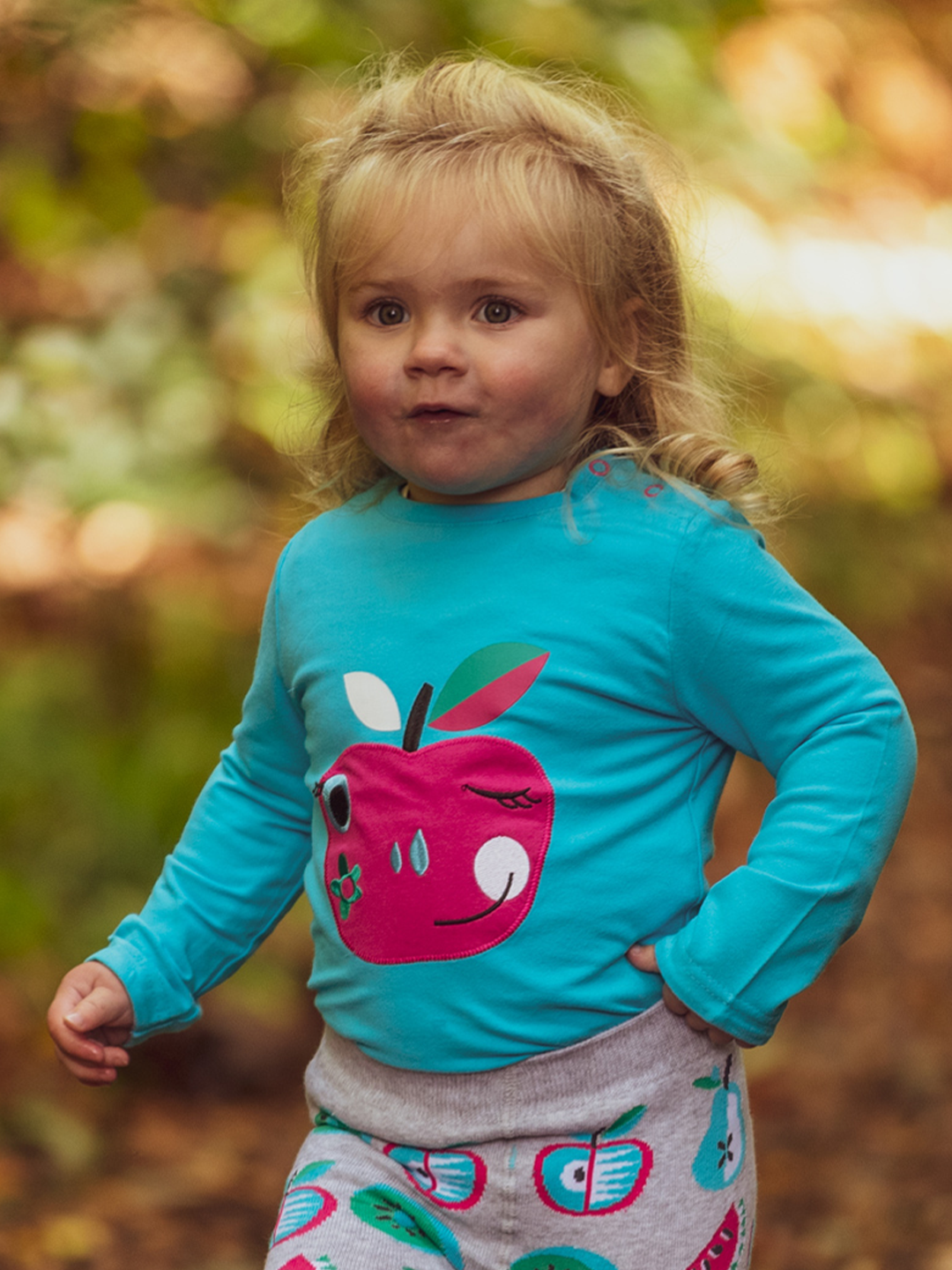 Bright blue top printed with a juicy apple on the front adding a touch of whimsy to this fun and funky design.